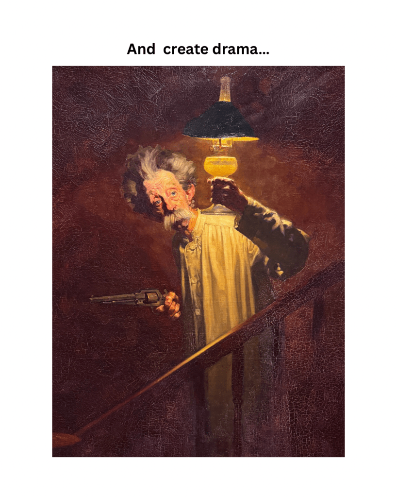 One very interesting aspect of the artist’s process was how he posed his characters, and utilized himself as a rubber faced modeler of expressions he wanted his live subjects to emulate as he took photographs, notes, sketches for every element pertinent to his desired end result.